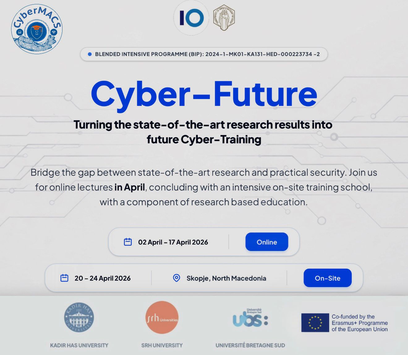 We are pleased to announce the Erasmus+ Blended Intensive Programme (BIP) titled “Cyber–Future – Turning the State-of-the-Art Research Results into Future Cyber-Training”, led by the Faculty of Information Sciences and Computer Engineering (FINKI) at Ss. Cyril and Methodius University in Skopje.